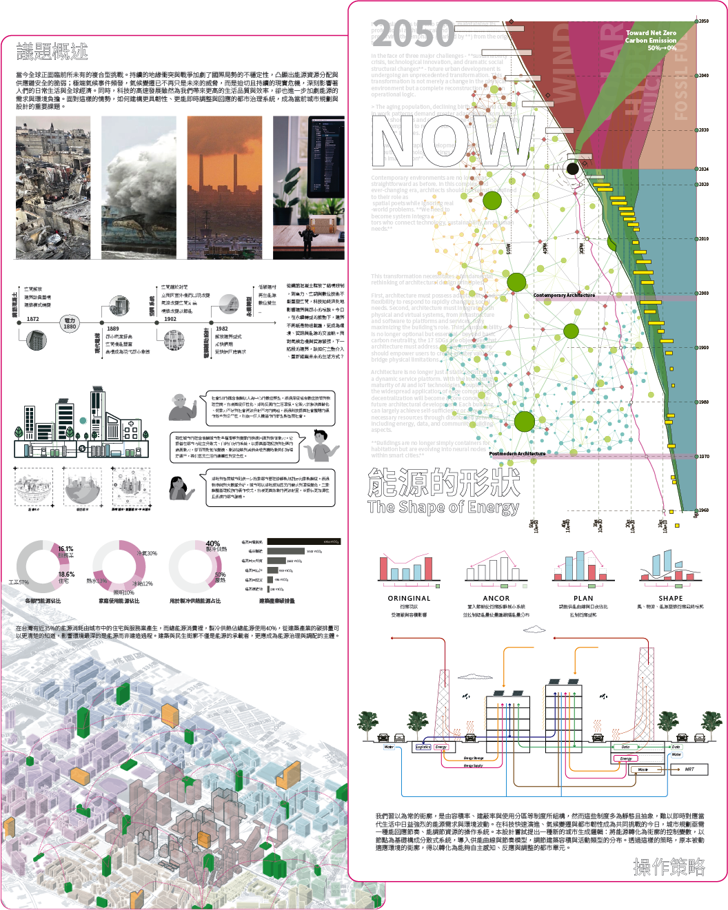 能源,不僅是城市運作的基礎,更是生活最真實的寫照。我從此出發,想像了一個由能源引導生成的街廓原型期望解決戰爭、氣候、科技等議題,雖然為了操作便利,捨棄了很多都市運作的複雜性,但在畢業設計這樣有限的時間與框架裡,我選擇聚焦在能源作為切入點,是因為我希望從一個相對被忽視、但又越來越核心的角度,重新思考城市空間生成的邏輯。