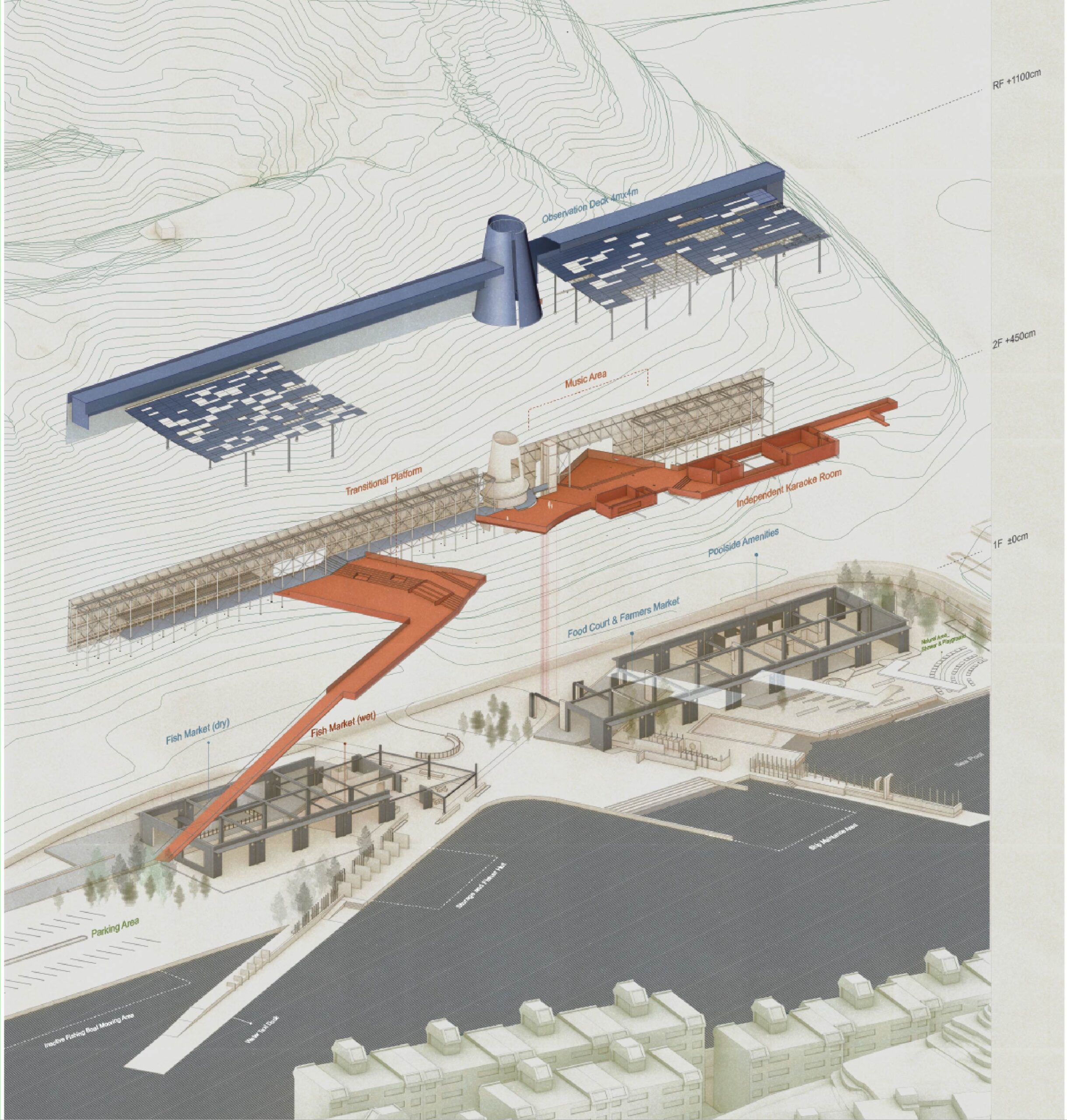 面對水岸,兩隻供漁船停泊的突堤,改變了平直水岸的單一性,以新的構造回應基隆海岸線應有的崎嶇地形。以拉伸的步道延長登陸的過程,在塔的引導下步向陸地,於地面轉折處望見多重風景。在略高於地面的層次,讓生產、消費與生活同時並存。一道在山與海之間具有厚度的縫隙,成為生活的場域。